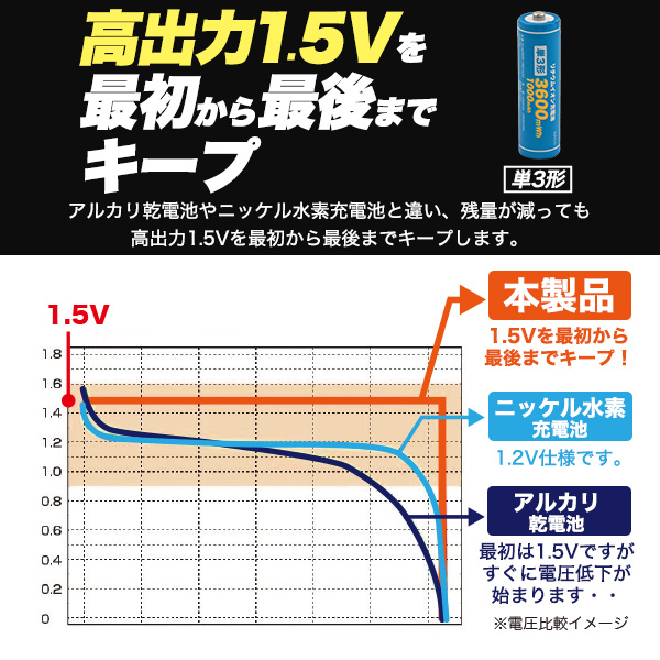 アルカリ乾電池やニッケル水素充電池と違い、残量が減っても高出力1.5Vを最初から最後までキープします。